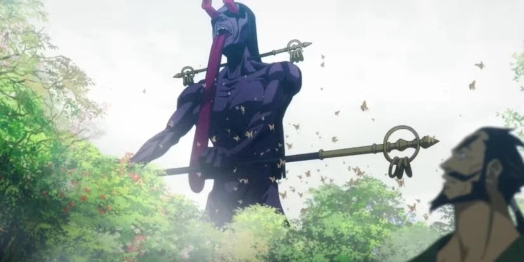 Religious symbolism is heavy throughout the series, particularly Buddhist and Daoist imagery, reflected in the monsters, architecture, and philosophy. We learn about much of this from Asaemon Senta.