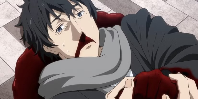 The most intense “bloody” moment comes right at the beginning: Satoru—Rimuru’s human life—is stabbed and left bleeding heavily, eventually dying in a pool of his own blood. Blood is shown on his face and soaking into the ground, and his friend’s hands become covered as he tries to help him. This scene is emotional and visually heavy, though brief.