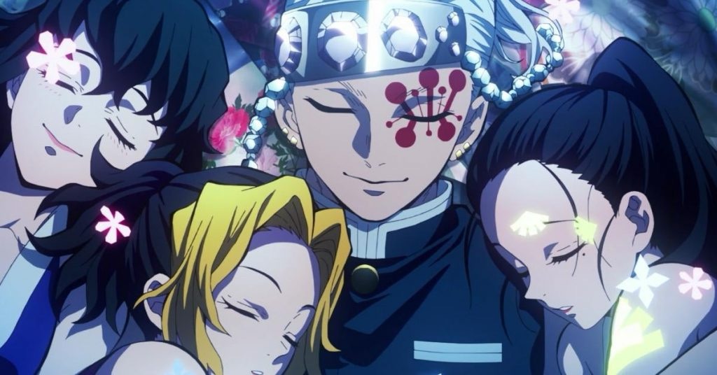 • Tengen Uzui, the Sound Hashira, has three wives. While the anime does not depict explicit intimacy, there are innuendos and brief jokes about their arrangement. There are also several moments of tenderness between the four.