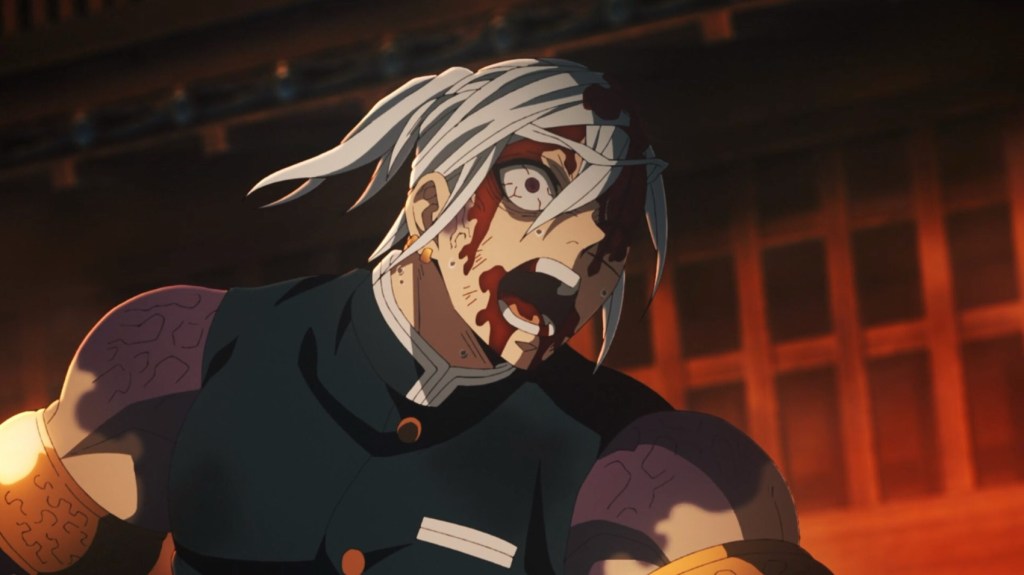 The battles involving Gyutaro escalate even further. There are severed limbs, poison-inflicted wounds, and characters pushed to the brink of death. The animation does not shy away from showing injuries—but it also doesn’t linger on suffering. While extremely bloody, I would still stop short of calling this arc outright gory.