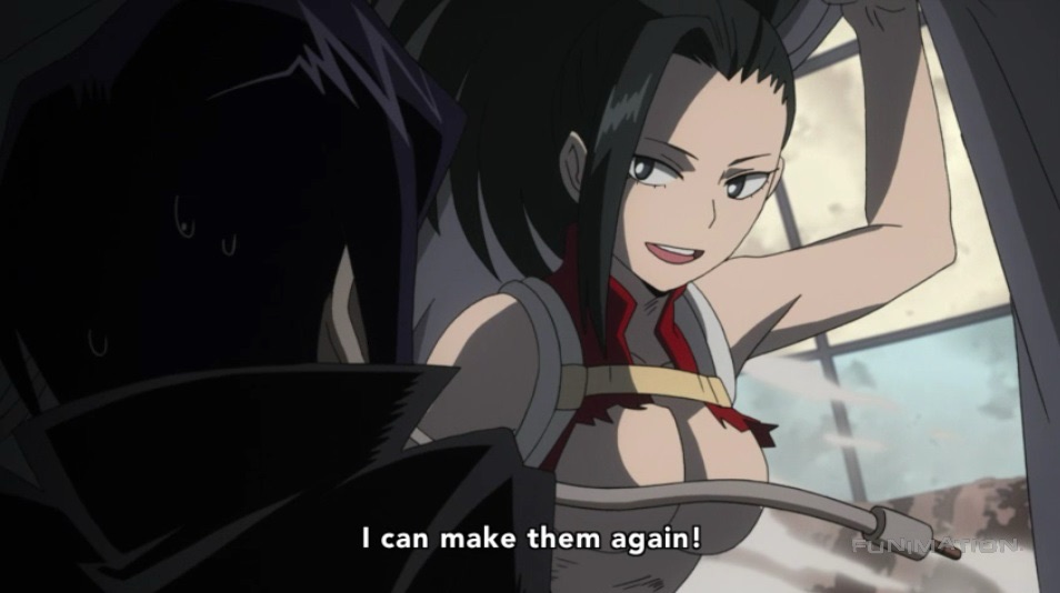 Yaoyorozu claiming she can remake her clothes even after they’ve been burned.Pro-Hero Midnight (far left)