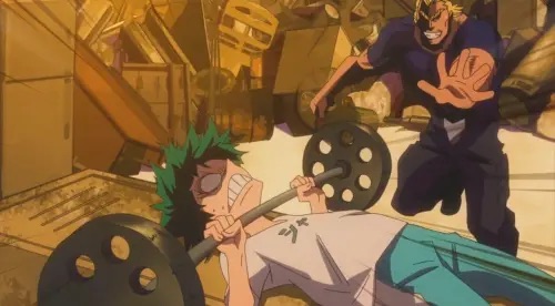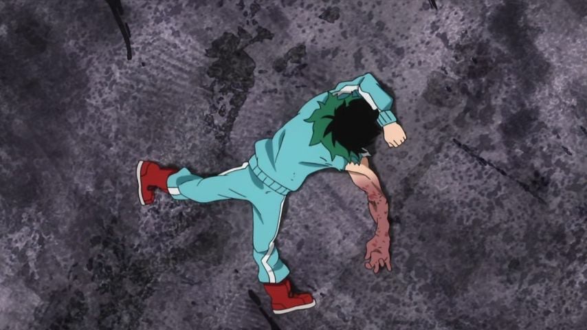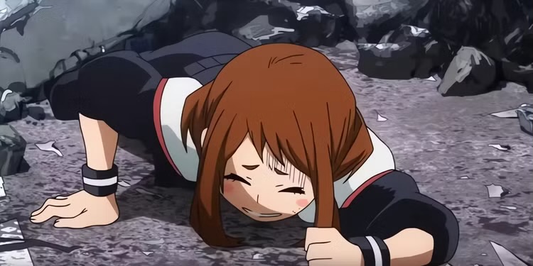 Uraraka stuck under rubble during the UA test: a giant mecha coming her way.Midoriya’s broken bones after saving Uraraka from the mecha.