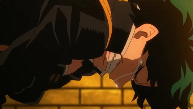 Because Midoriya was born without a superpower (called a “Quirk” in this world), he becomes the target of relentless bullying from Bakugou and other classmates. At one particularly troubling moment, Bakugou goes so far as to tell Midoriya he should take a “swan dive” off a building.